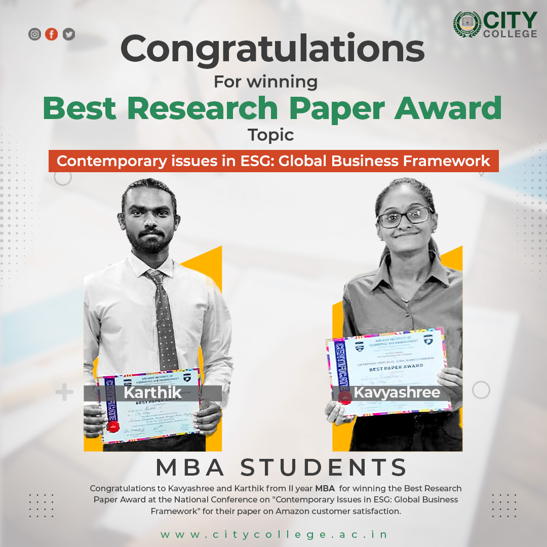 City College Jayanagar BangaloreCity College Jayanagar is proud to celebrate the remarkable achievement of Kavyashree and Karthik, second-year MBA students, who have been awarded the Best Research Paper Award at the prestigious National Conference on “Contemporary Issues in ESG: Global Business Framework.” Their insightful paper on Amazon customer satisfaction has garnered significant recognition, making both the students and the college incredibly proud.